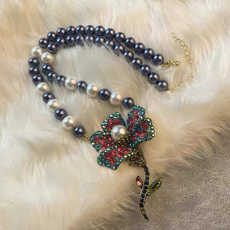 • Necklace Chain: Features a unique, graduated chain made of alternating dark blue/purple polished pearls and classic white faux pearls.